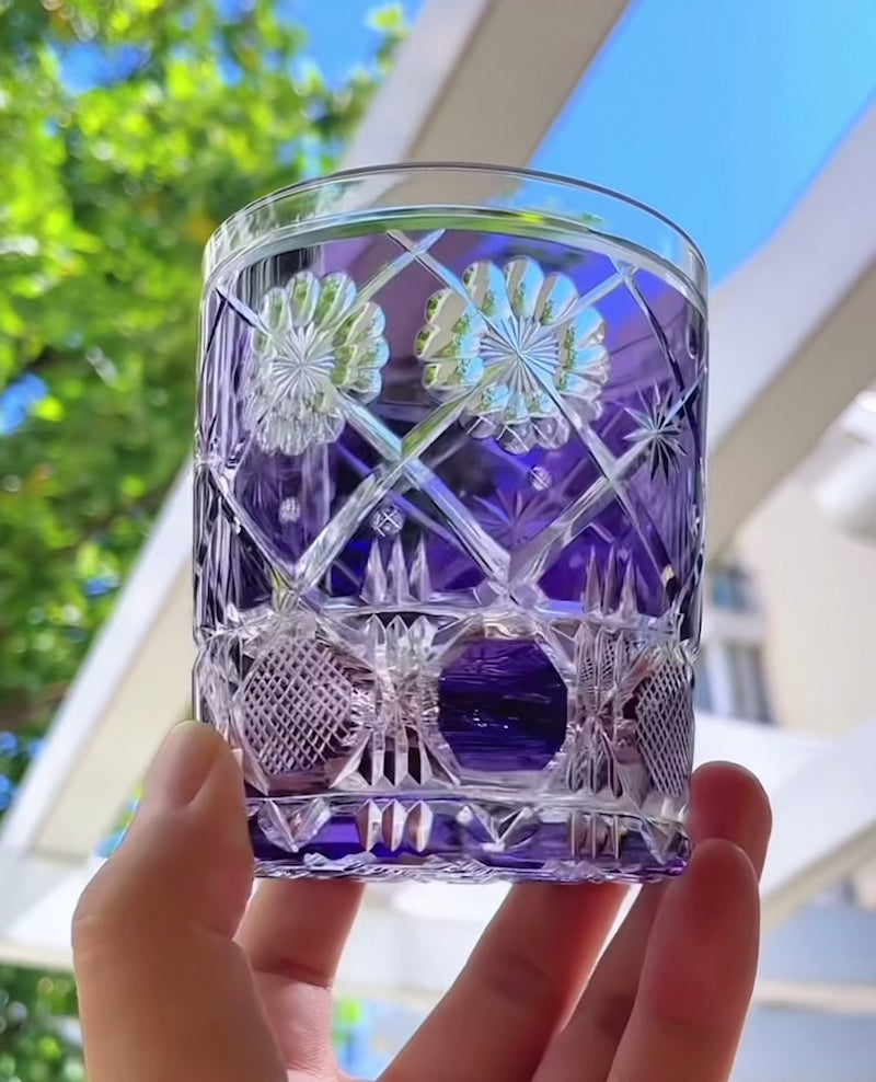 Edo Kiriko Handcrafted "Violet Kohana Blossom" Crystal Glass – Japanese Artisan Luxury with Wooden Box