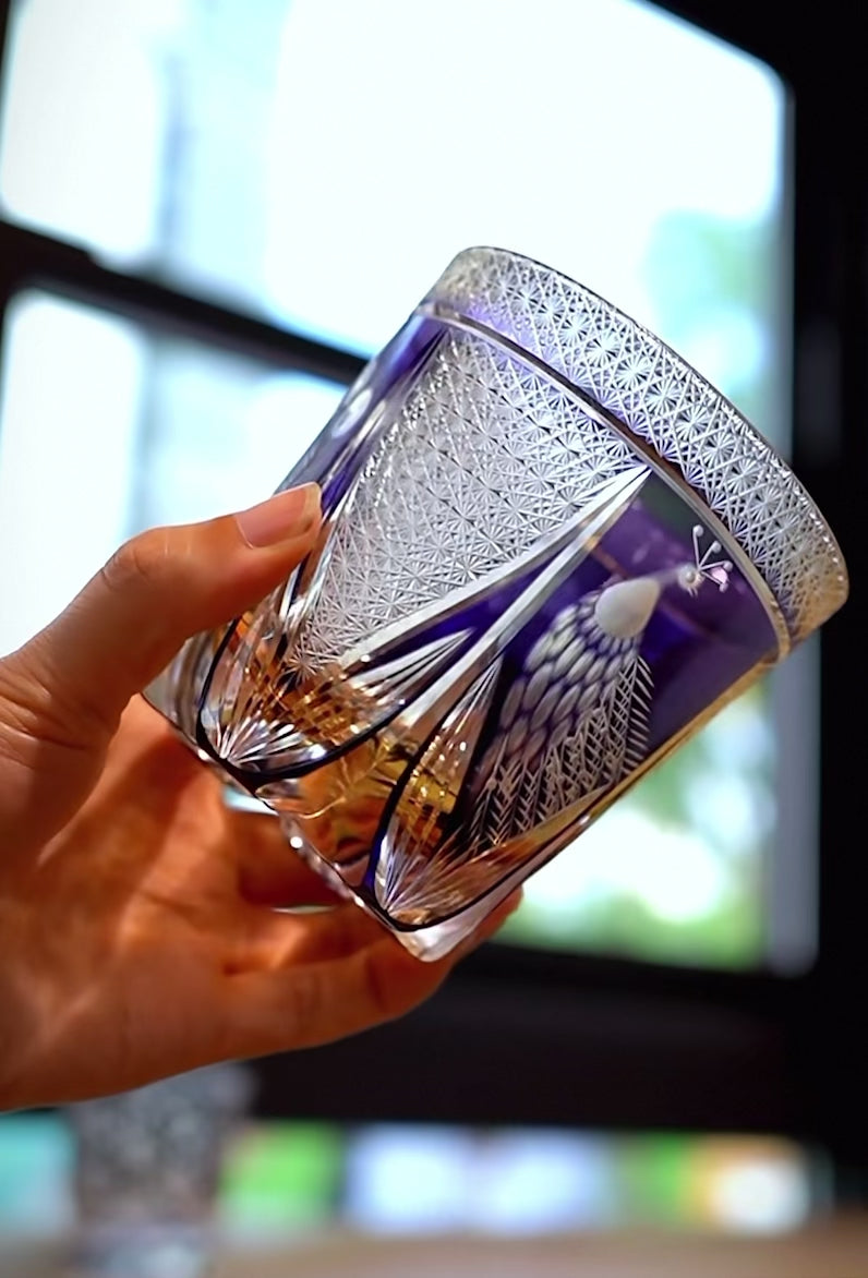 Edo Kiriko Handcrafted Violet Peacock Whisky Glass – A Royal Bloom in Crystal