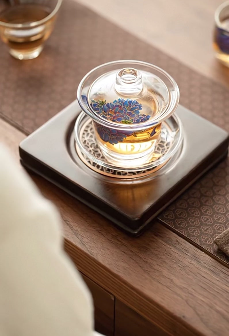 xperience the beauty of your tea as it brews with this stunning glass gaiwan. Adorned with a delicate peony motif and designed for comfort, this large, anti-scald piece is the perfect tool for any tea lover.