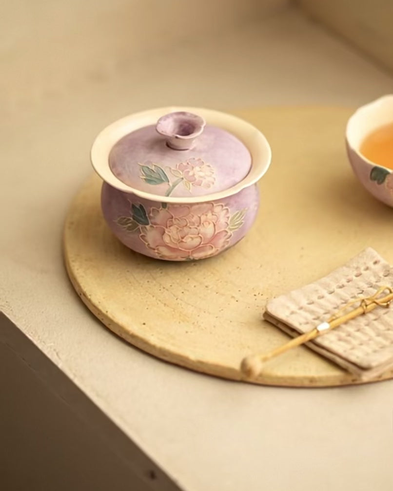 This Gaiwan is a masterpiece of tactile artistry, combining traditional "Relief Carving" with exquisite hand-painting. Inspired by the "Budai" (Cloth Bag) shape—a symbol of fortune and abundance—and featuring the "Purple Rhyme" peony, it is a high-end vessel that brings a sense of opulence and "Zen" prosperity to any tea table.