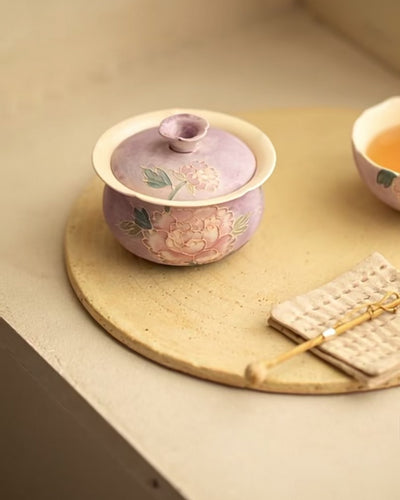 Relief-Sculpted Hand-Painted "Purple Rhyme" Peony Cloth-Bag Gaiwan